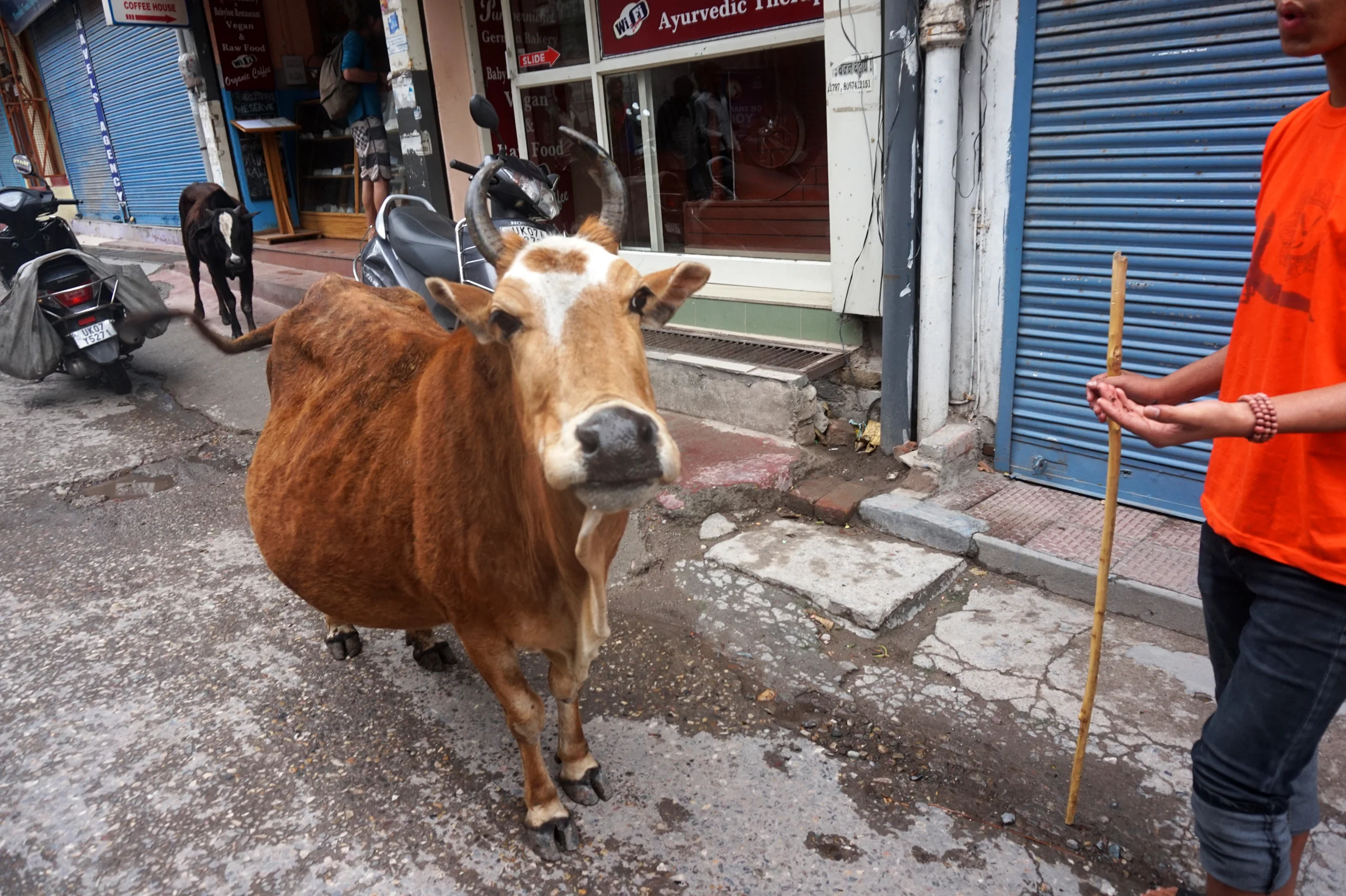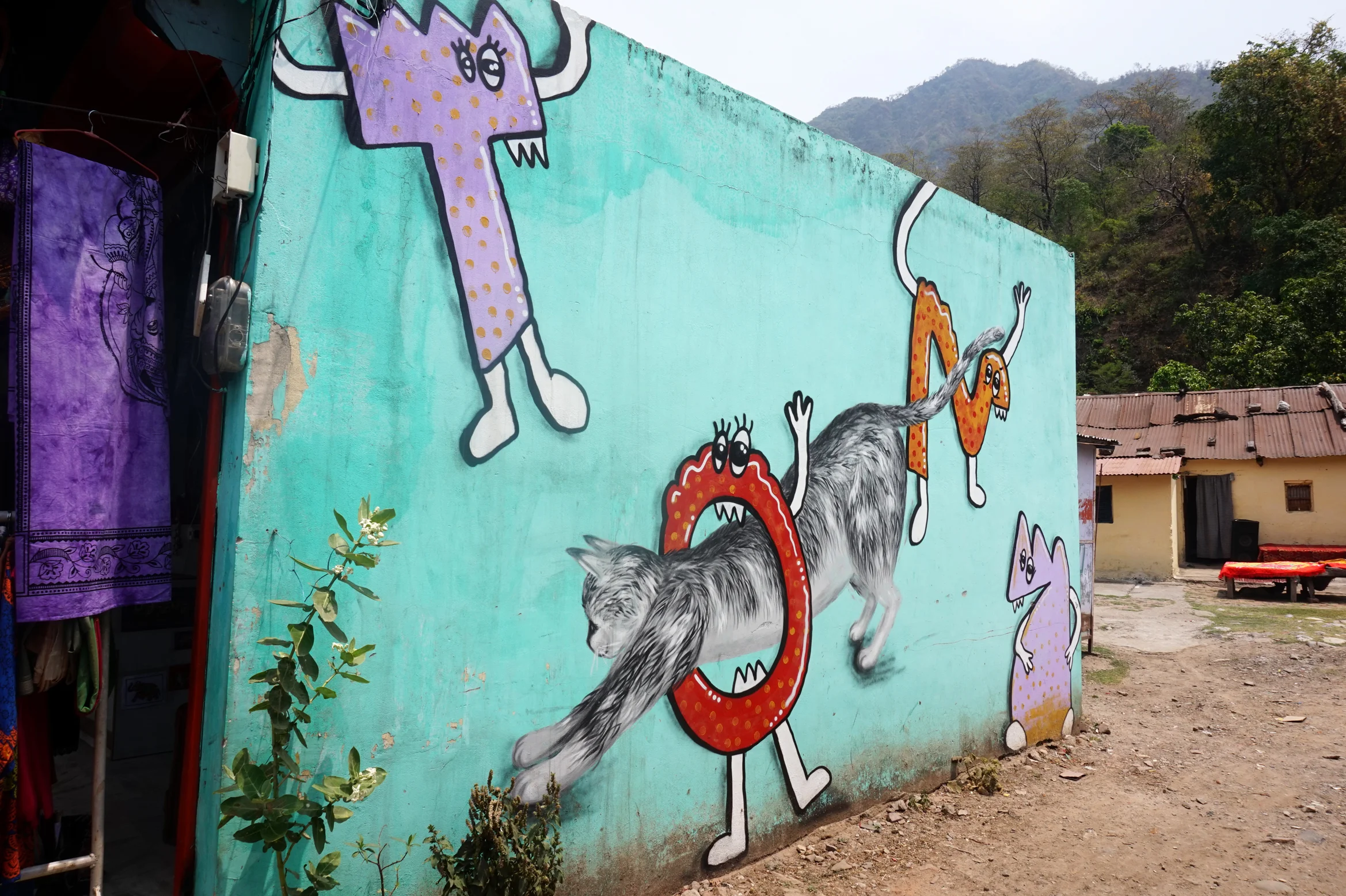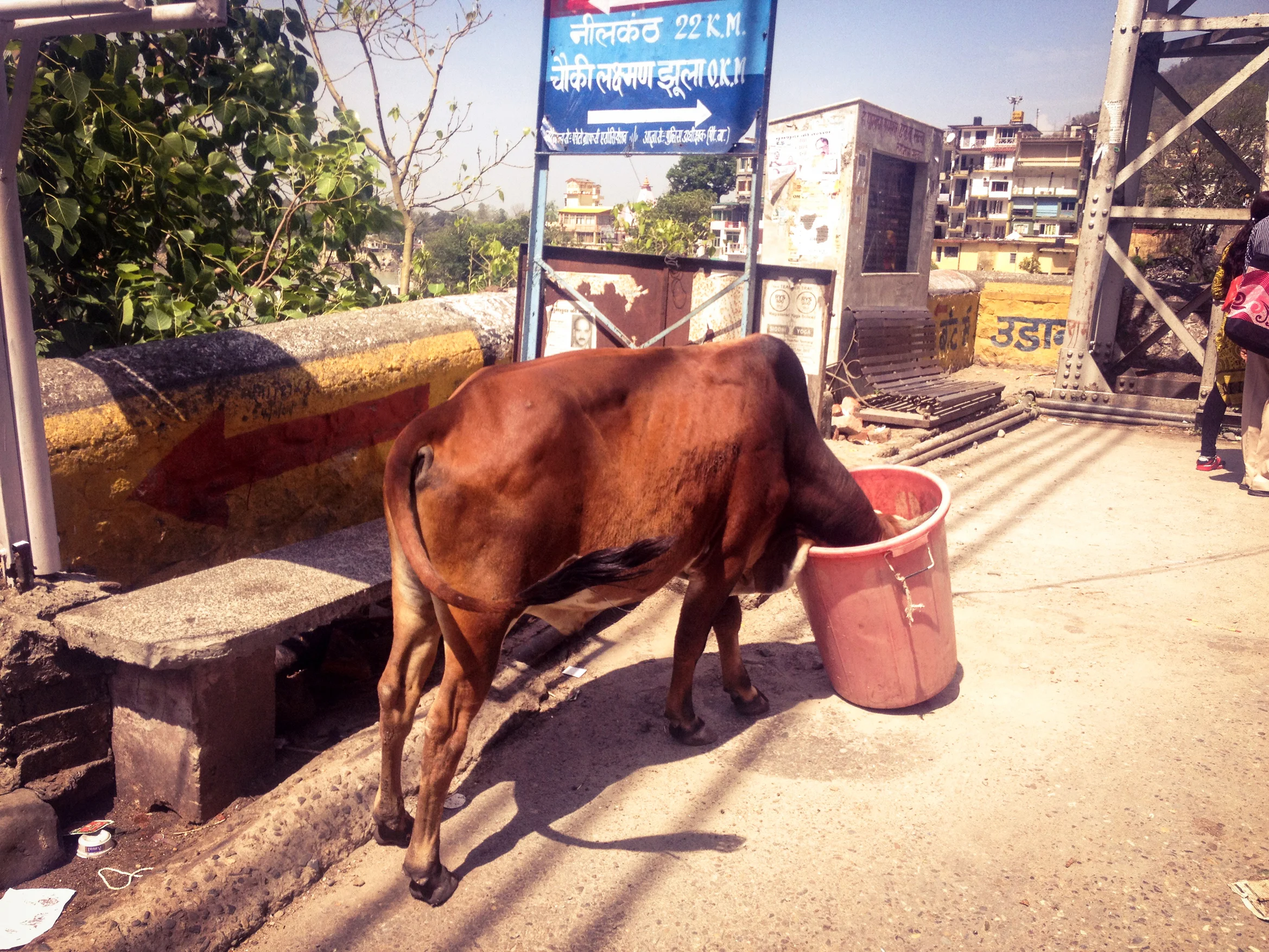 We woke round seven to find we still had our bags, wallets and kidneys. (Phew) Luckily no one had spotted us so we silently crept back down off the roof and slipped out into the hustle and bustle of the morning. We found a little bamboo clad cafe for breakfast, tucked away down a tiny alley on the riverside next to Laxman Jula footbridge. It was a calm little spot hidden from the main road. A large bowl of fruit, a short doze and a few coffees later, we went off in search of a place to stay.