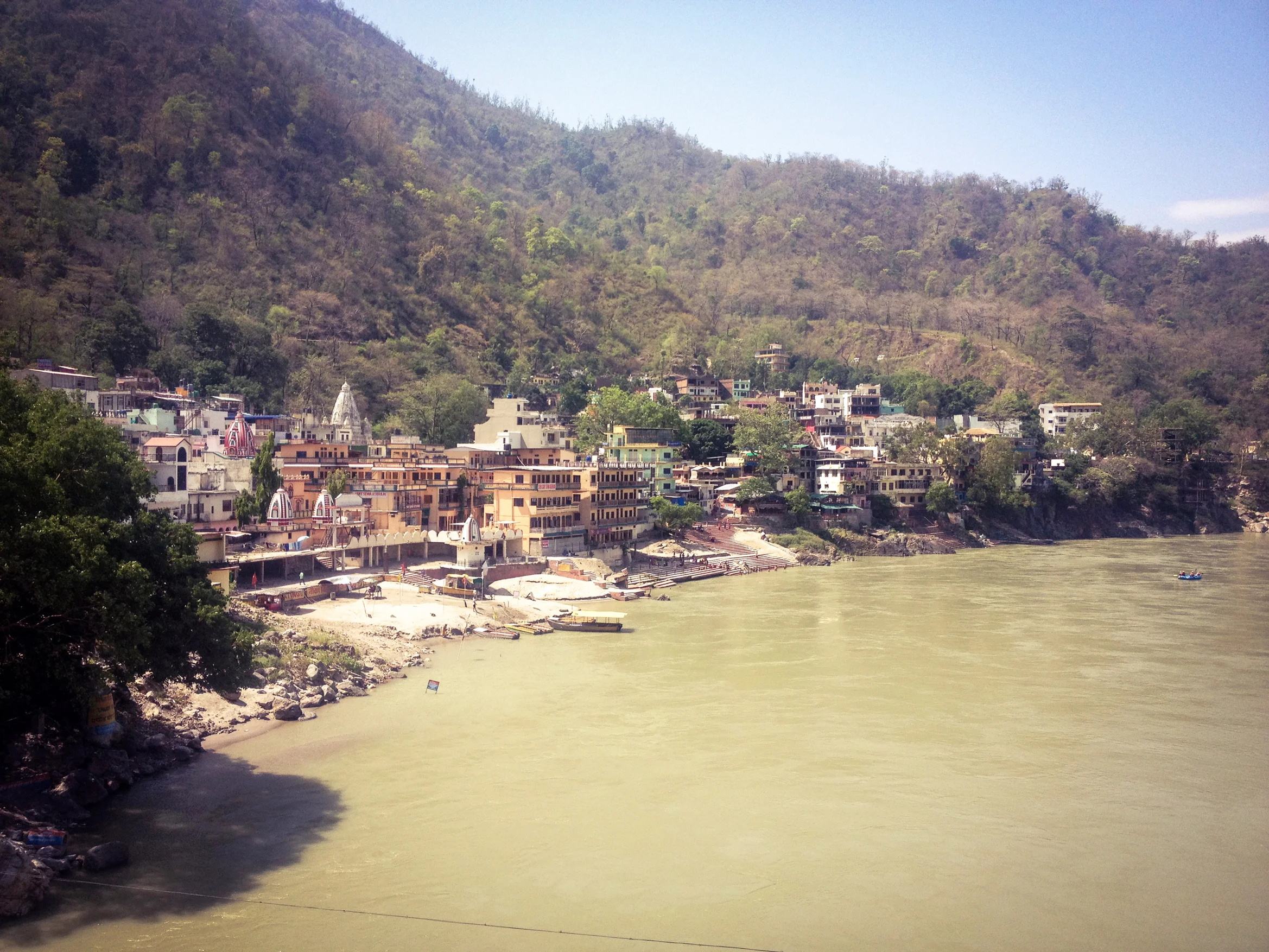 Eventually it was time to give rafting a go. We crossed the river, hopped on the back of a scooter to the rafting place and were bundled into the back of a jeep heading 16km up stream. It was a pretty spot surrounded by lush Himalayan foothills lit by the hazy afternoon sun. Everything was peaceful except the river, which looked a bit pissed off and not particularly inviting. It was just me and Helen in the end, however we had two guides in the boat and two safety folk in canoes following us down stream, which seemed a bit OTT, but we soon realised they were incredible canoeists and were using the lift up stream so that they could have a play. The rafting was amazing. It was pretty hard work paddling especially at times when the boat was at such an angle you couldn't reach the river with the oars. At one point we nosedived into a rapid throwing me and one of the guides over board. Refreshing would be an understatement. We glided onto the riverside beach outside our ashram in the early evening wet, tired but feeling awesome.