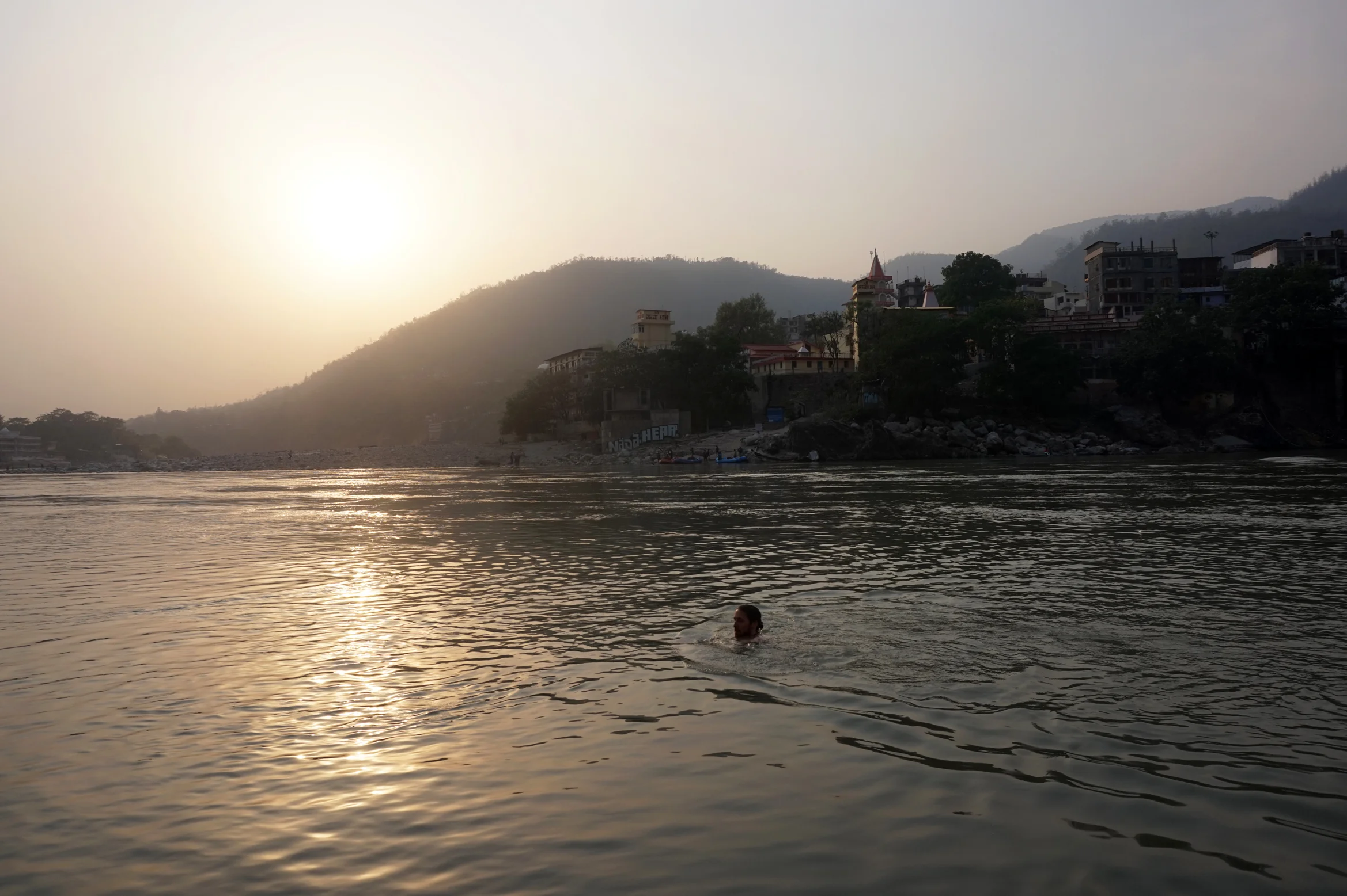 We failed our attempt to go rafting (due to a long lie in and lazy morning) so we settled for afternoon yoga back at the ashram, followed by a sunset swim. Helen opted to sit on the bank while I tried to wash off more of those pesky sins.