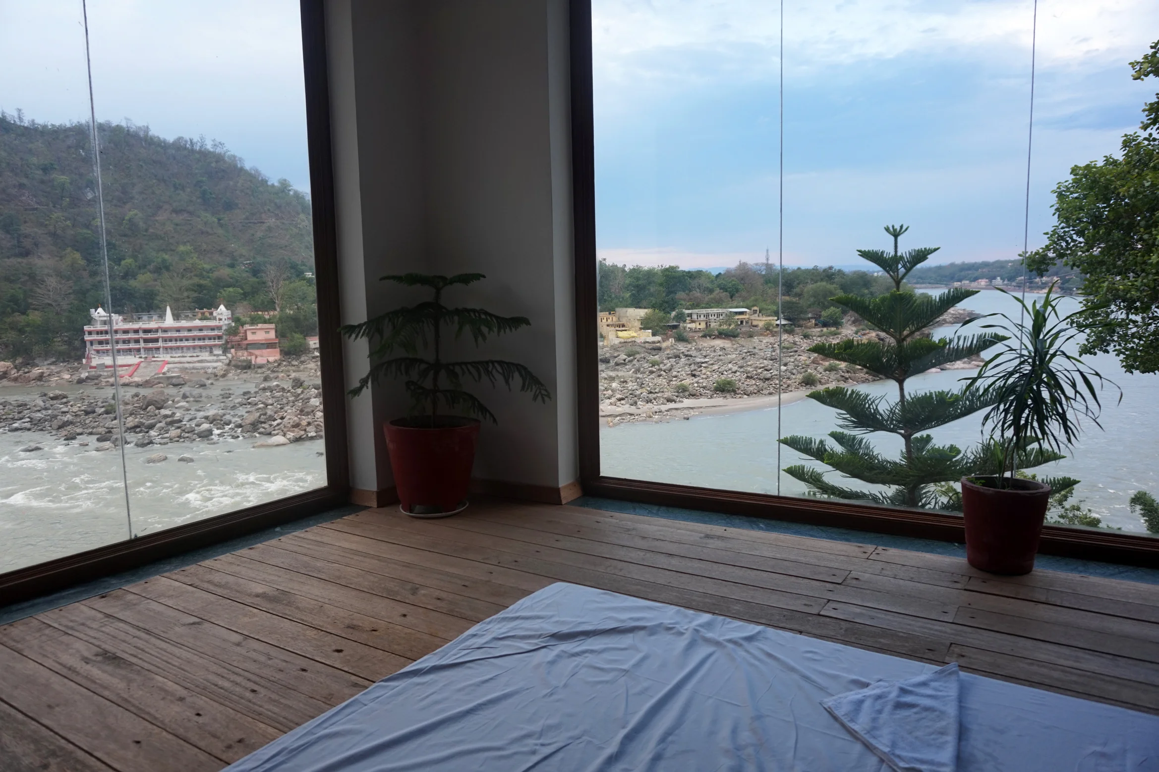Our location for the afternoon was the more upmarket hotel of Devine Ganga. We had booked two treatments each the day before. The first was a head / mind relaxation massage where hot oil is dripped on you forehead and you get a bit of a head massage. It is apparently a really popular India treatment, but we were not that convinced. It was nice and all that, but probably won't do it again. The second treatment was a full body massage which was really good but at time verging on painful. The rooms looked out over the hillside and the river which added to the whole experience. I was sitting looking out the spas massive window when I was told Helen wasn't feeling too good and had been sick. We think it was a devious street stall samosa from lunch after rafting, mixed with a good dose of river water. Helen slept in the spar for an hour trying to get her strength back. The chap there was really helpful and bought some special tea that is good for the stomach as well as recommending things to eat that would help. We stayed at the hotel for dinner overlooking the river as the sun turned the sky pink. It was very nice but a shame for Helen. She said it was the only time she has been sick on her birthday without drinking any alcohol!