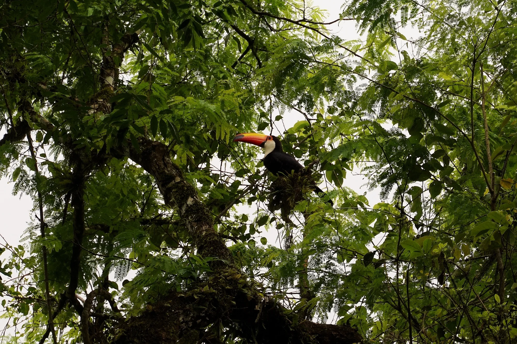 After the high road we took the low. This zigzagged through more jungle and descended about half the waterfalls height. Whilst taking in the falls from various angles, two toucans played about in the tree above our heads. They are odd yet beautiful creatures. Palin describes them as "a beak with a small bird attached".
