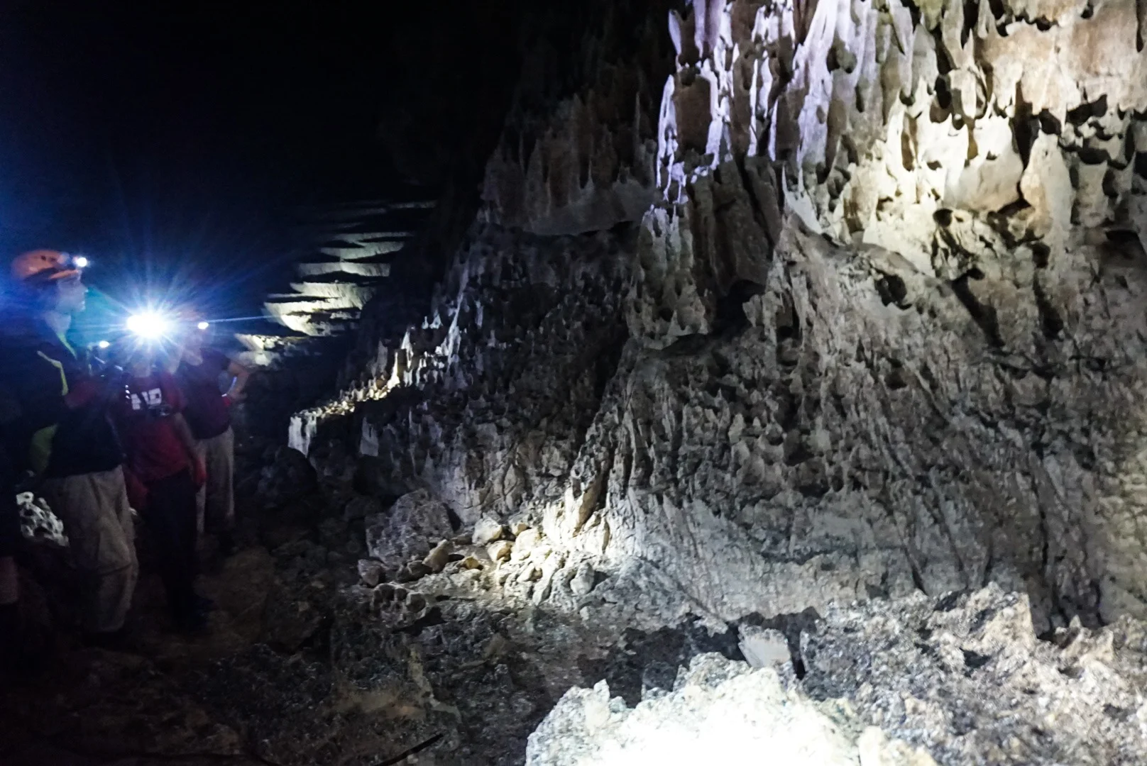 As we got closer we turned a corner and headed for another, smaller entrance. We were told that the big entrance was too dangerous to enter through, but that we'd get a brilliant view of it from inside the cave. As we entered the much lower entrance, we had to put on our hard hats and really powerful head torches. It got dark very quickly as we made our way deeper into the cave. We stumbled over rocks and rubble, went through a river in the cave and finally climbed upwards to be greeted with the most incredible view. Our camp was already set up inside the huge cave, on the beach next to the bright blue water of the 'swimming pool' and the whole scene was lit by the huge window of the massive entrance we had seen first. It was unlike anything I've seen before - the size of the cave was uncomprehendable. There would be so many incredible climbing routes! We were later told that the locals used to climb to get birds eggs without ropes! We stayed up on the viewing platform for a while taking the whole thing in. Then it was time to scrabble down the rock to reach the beach. We chose our tent, dumped our stuff and were greeted with a lovely cup of tea. We then were taken up to another high up place to get another view of the cave. The torches were brilliant at lighting up the cave walls and ceiling so that we could see the texture and colours of the rock surface properly.