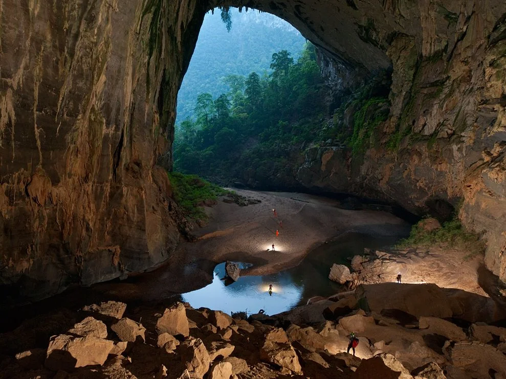 The next morning after a fine breakfast of banana and chocolate pancakes washed down by a cuppa, we hiked over to another chamber in the cave which has a much much larger entrance. In fact this sight was featured on the front cover of National Geographic and won many photography awards. I've put the famous photo below. You can kind of get a sense of scale when you see humans in the pictures, but seriously, you just gotta go there! After the initial wow at the top, we scrambled down and stood at the bottom. The height is unreal, and there's a tree growing downwards from the roof. A river snakes through and there were waterfalls falling through the rock.