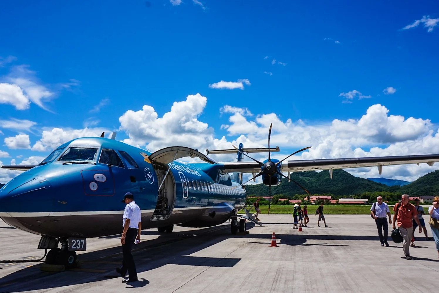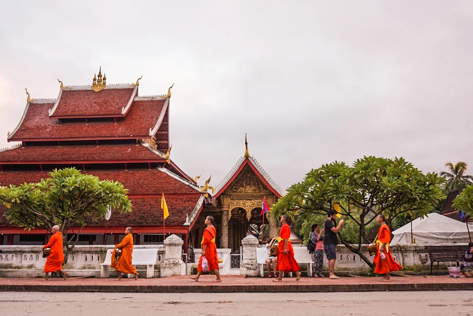 We took the midday flight from Hanoi to Luang Prabang in Laos. The scenery when we were descending into our 7th country of the trip was green green and more green. The landscape was undulating and lush and we could tell we were going to like it here. This feeling only increased when we drove into the town from the tiny airport and it was worlds apart from busy Hanoi. This was a sleepy town with one main road, dotted with many many Buddhist temples.