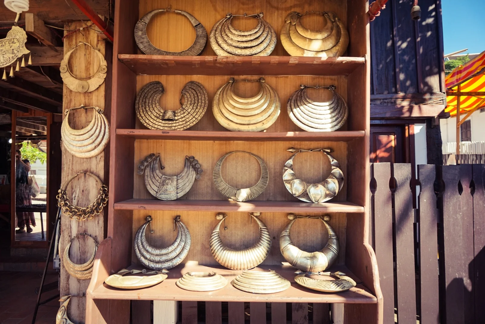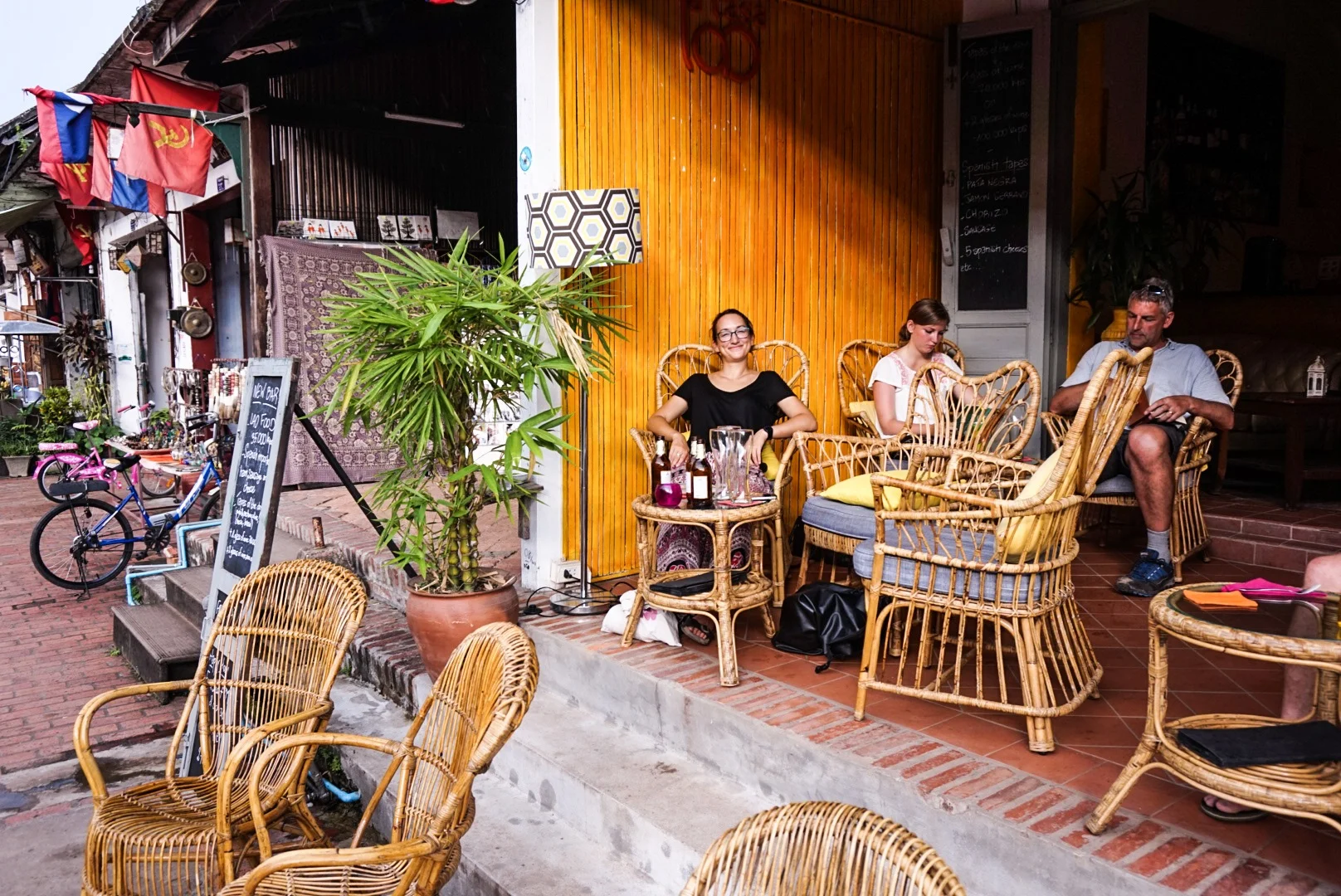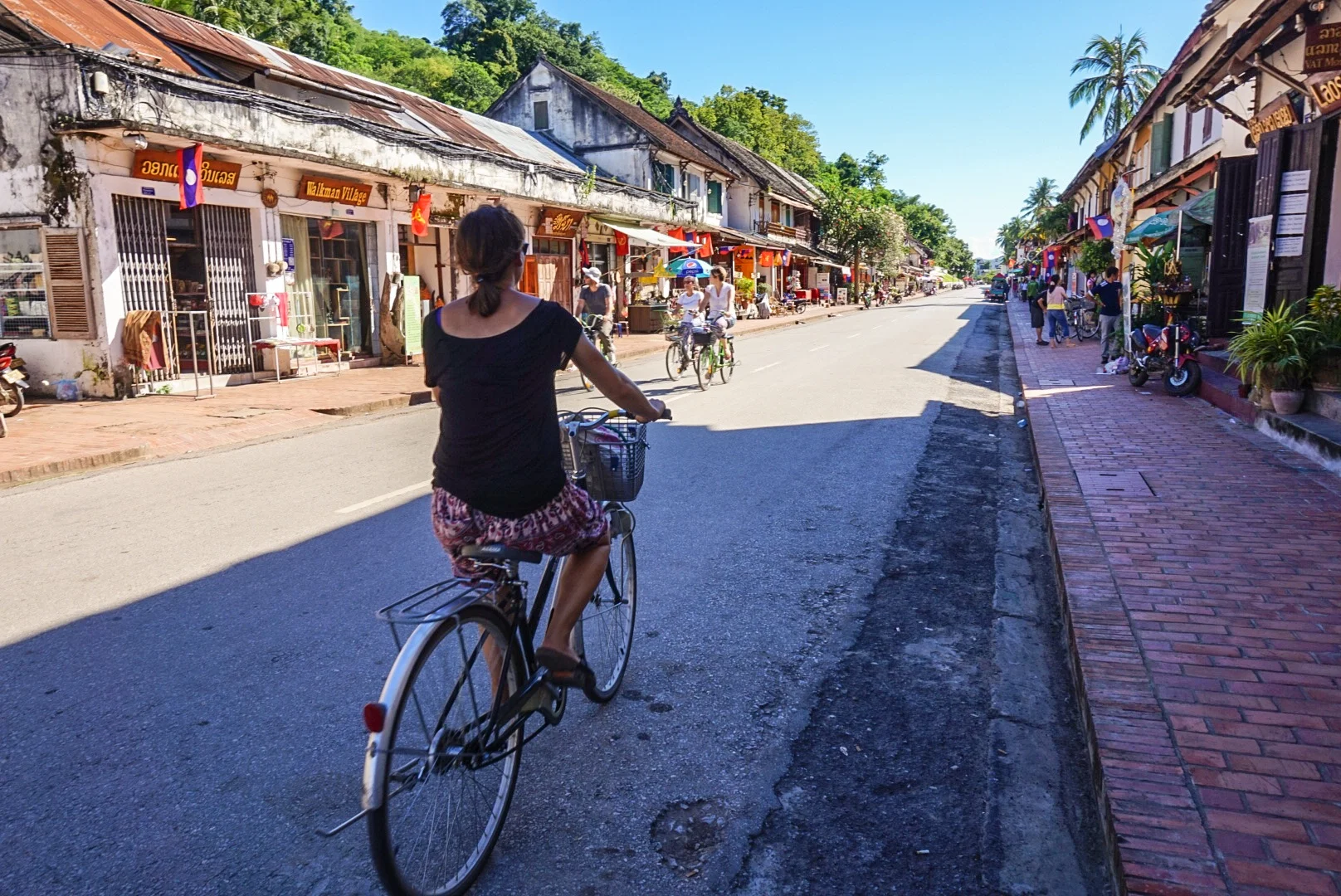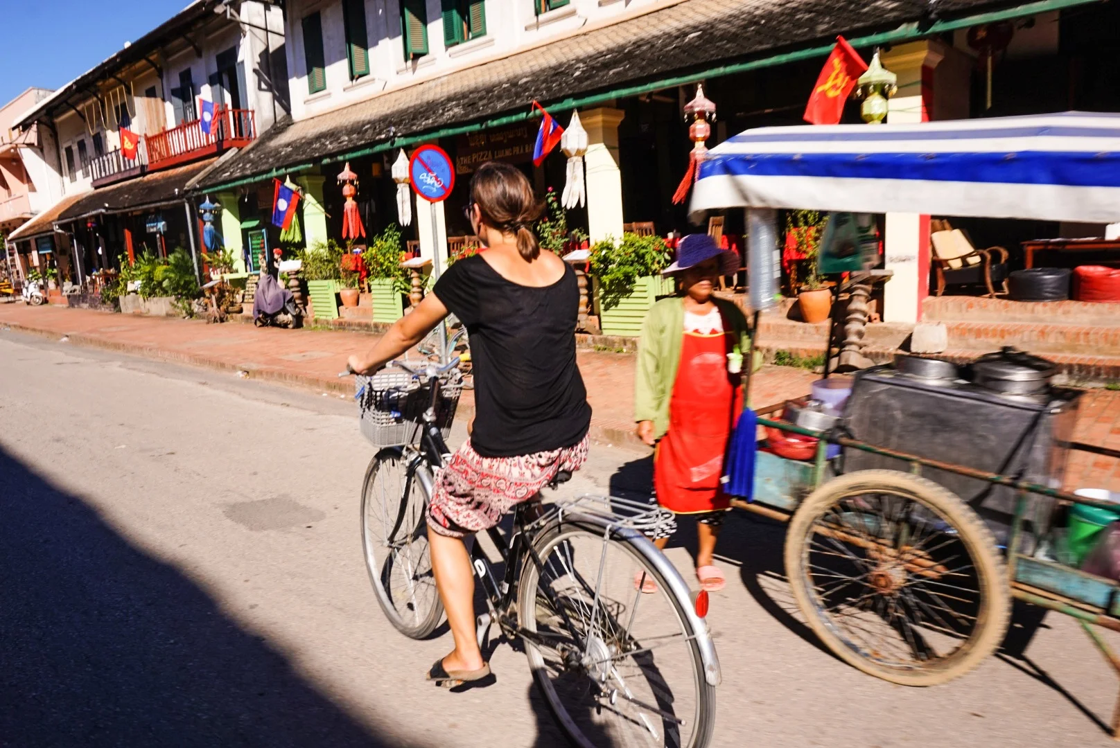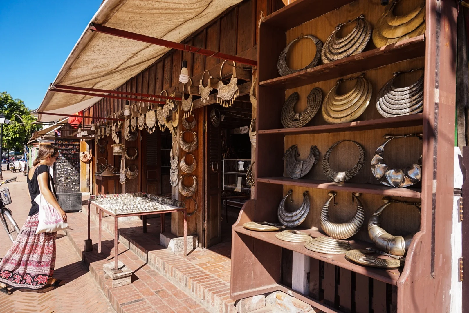 Then it was time to explore the town, so we ambled up the main street, stopping often to wander into shops full of incredible Laos jewellery. The surprisingly lightweight metal necklaces were beautiful, and they had incredible turquoise and silver jewellery on offer too. As well as this there were a lot of beautiful wooden objects on sale. We wanted to buy it all, but instead showed our usual constraint! We popped into a bar for a beer when there was a quick rain shower, but other than that it was a glorious sunny hot day, again in contrast to Hanoi!! The main shopping street does not allow vehicles - including motor bikes, wahoo!