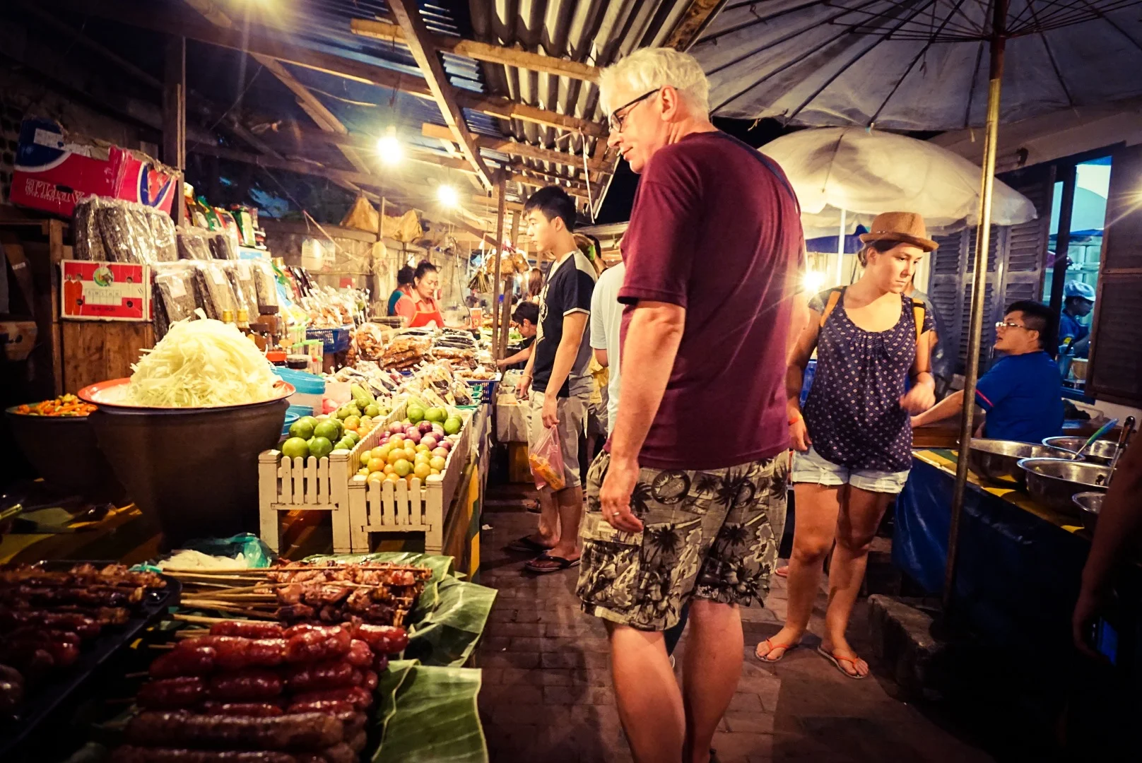 On the Main Street we found a huge night market had sprung up and was in full swing. Of course, the usual traveller aimed stuff was on offer (beer t-shirts, elephant pants, etc) but there were also some gorgeous handicraft items like hand woven scarfs, jewellery and traditional clothing.