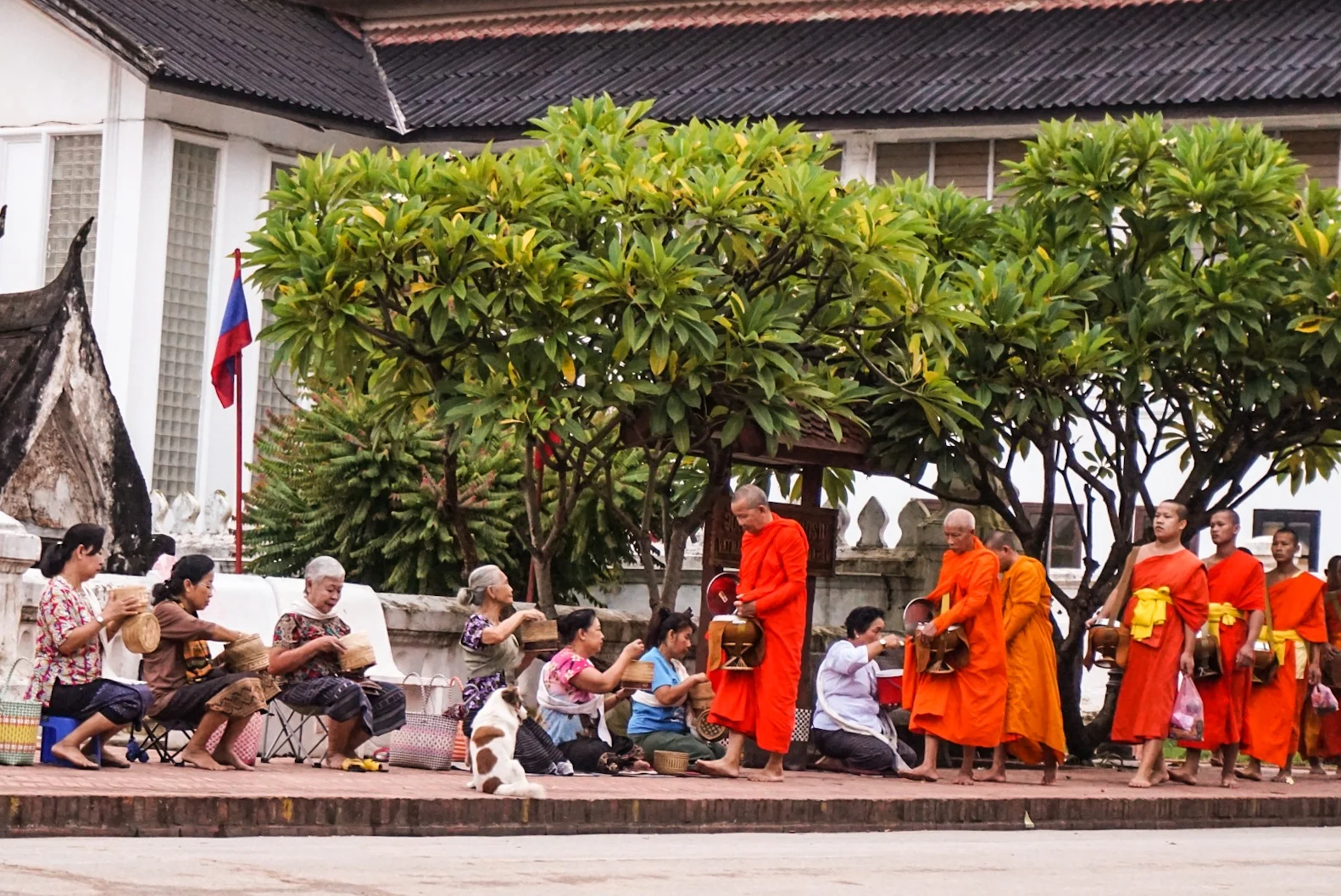 Once people had got the photos they wanted, they disappeared off, and we were able to observe a second group of monks coming by, and they were much less disturbed by the Westerners and it was a much more peaceful sight. Once they were ready to go back into the temple grounds, they turned to the women lined up on the floor and chanted a haunting tune and then slowly, quietly and purposefully they strode back in.