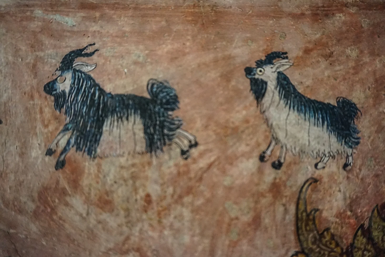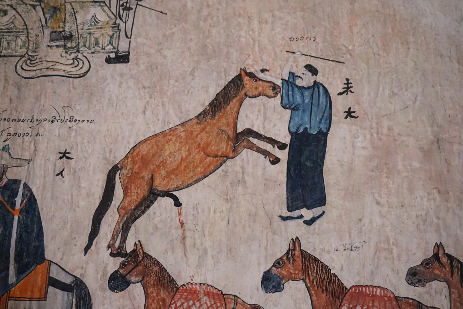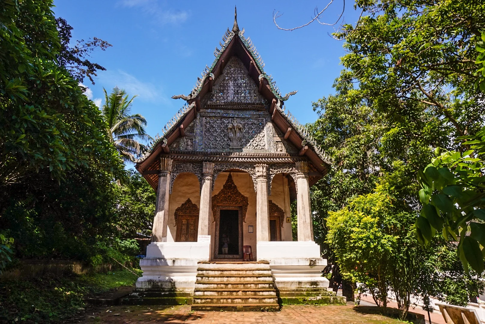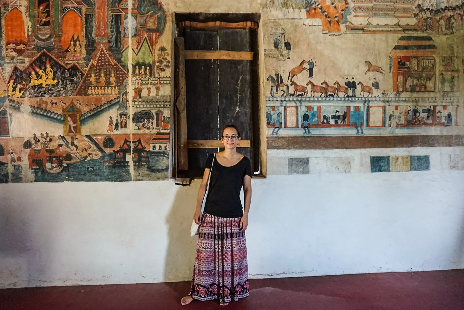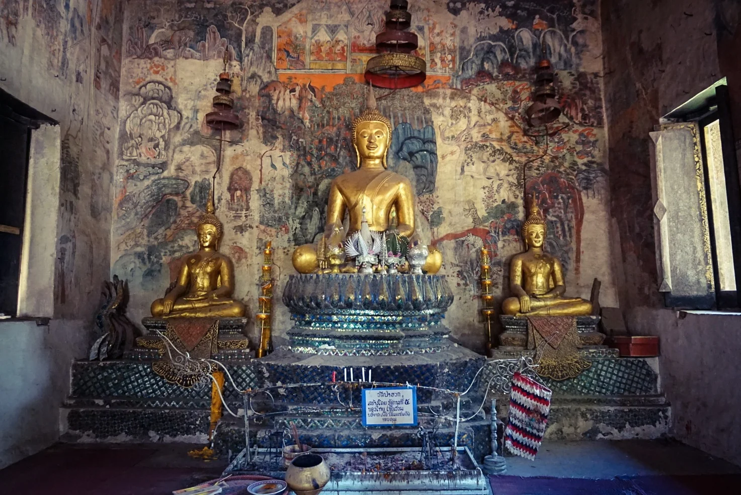 In the morning we rented bikes to make sure we squeezed everything in to our one day. It was bloody boiling, but cycling actually gave you a fair amount of breeze if you got up enough speed! We headed to Phu Si, a temple on the hill for excellent panoramic views of the town and the rivers. At the temple there were ladies selling the usual flowers, and offerings, but they also had something for sale we'd not seen before. Tiny birds in tiny bamboo cages, that you take to the top of the hill and release. We wondered if they caught them each morning to be released by worshippers throughout the day! On the way up to the temple was a small wooden temple that had amazing old paintings on the walls.