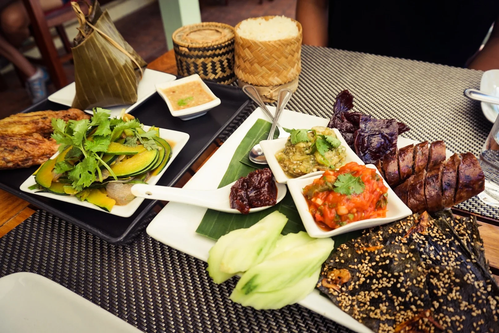 We went for an expensive lunch at a restaurant called Taramind and had their tasting platter. As we had such a short amount of time in Laos, we wouldn't get to sample much traditional food, so we thought we'd get it all in one hit. It was completely different from anything we've had in Thailand, Cambodia and Vietnam!! We had aubergine and tomato dip, a spicy jam, sticky rice, chicken cooked on a stick of lemongrass, amazing beef jerky, a vegetable stew that had very unusual flavours, and local sausage. For pudding we had coconut sticky rice with sweets.